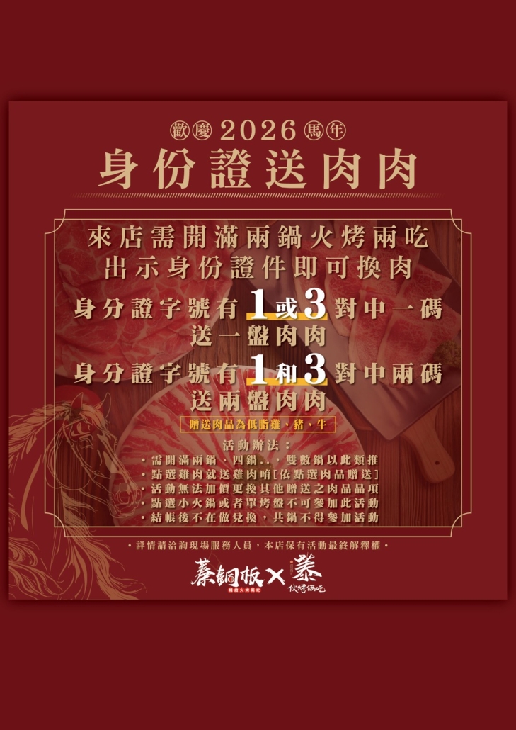 只要來店開滿兩鍋火烤兩吃,出示證件即刻兌換。